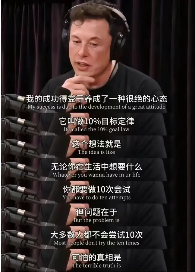 特斯拉创始人埃隆·马斯克在一次采访中提到,他获得成功的一个关键定律:10%目标定律。