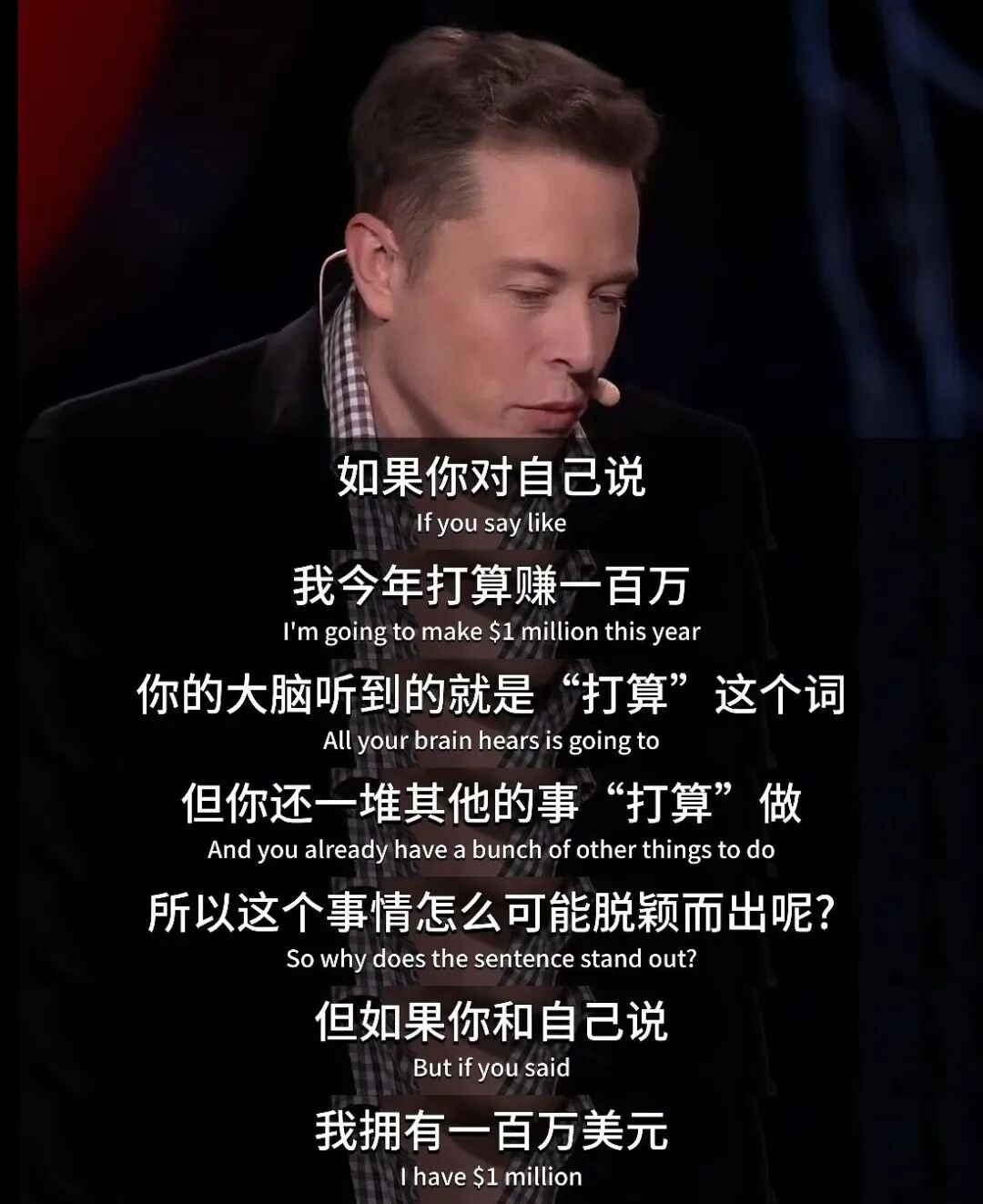 马斯克曾说:如果你对自己说,我今年打算赚一百万,你的大脑听到的就是“打算”这个词,但你还有一堆其他的事“打算”做,所以这个事情怎么可能脱颖而出呢?