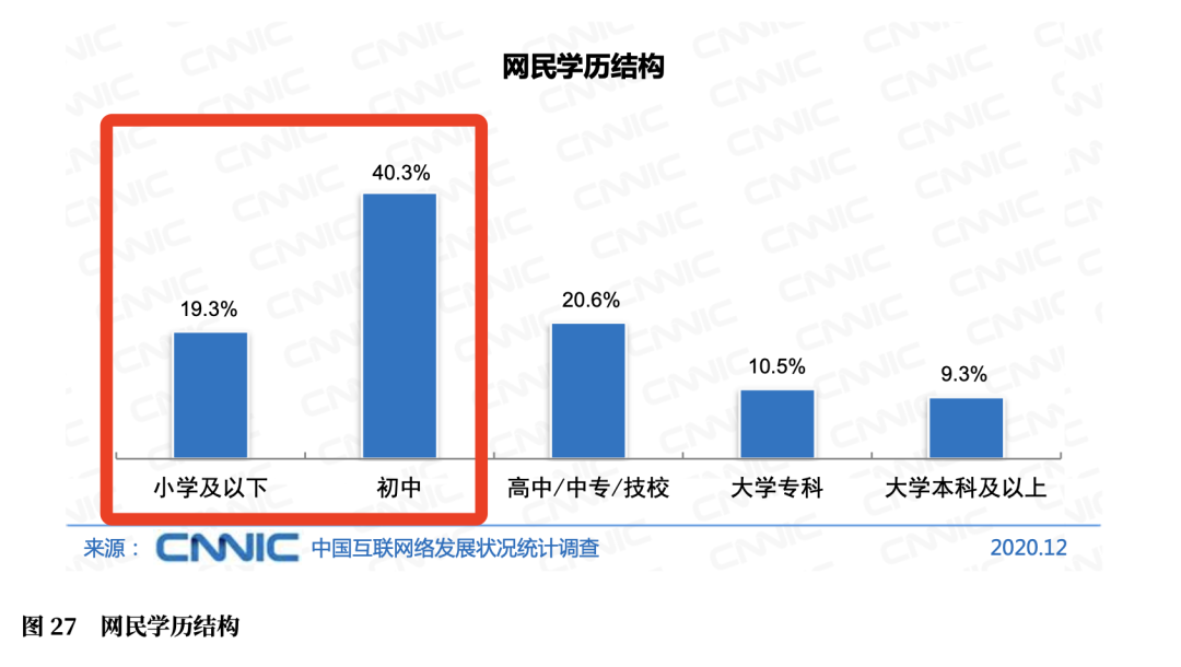 而根据中国互联网络信息中心2021年初发布的《第47次中国互联网络发展状况统计报告》:截止2020年底,中国59.6%的网民最高学历是初中,高中及以上学历的网民仅有41.4%。虽然自从这份报告后便不再公布网民学历结构相关数据,但我们知道像“学历结构”这种宏观的数据,两三年内是不会出现太大变化的。