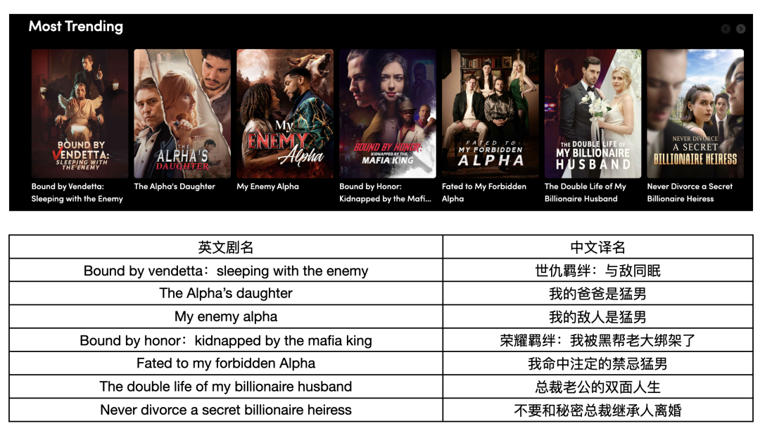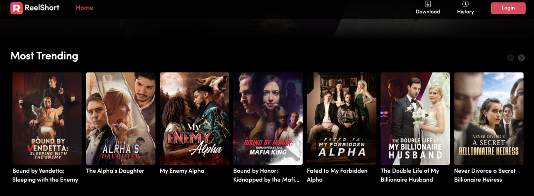 打开ReelShort首页,最先看到的就是目前比较火的几部短剧。扫一眼你就会发现,一大半短剧的标题里都有Alpha这个词。
