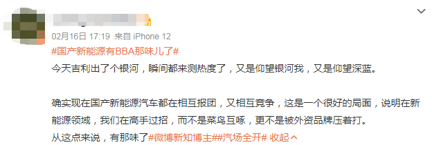 汽车厂商的热情互动点燃了网友和大V们的玩梗DNA,大家都不甘于当观众,纷纷加入了这场新能源汽车圈的狂欢,引爆#国产新能源有BBA那味儿了#话题。