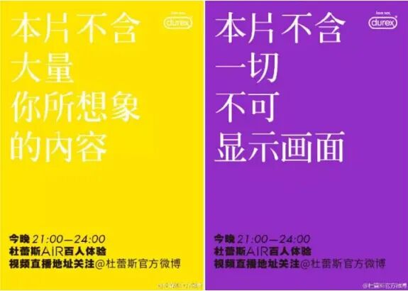 直播前45分钟,杜蕾斯在声明海报中提前打预防针,“本片不含大量你所想象的内容”、“本片不含一切不可显示画面”,却更提升了大众的期待。
