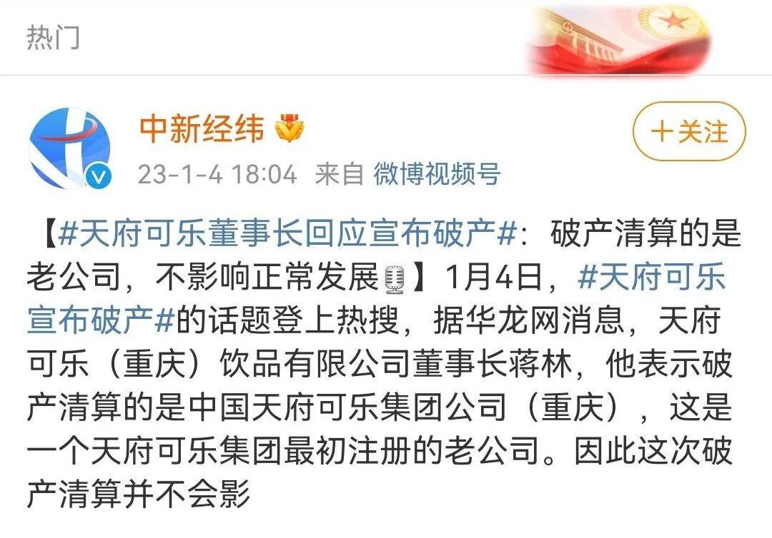 然而事情很快“真相大白”:原来破产清算的是一个天府可乐集团最初注册的老公司——中国天府可乐集团公司(重庆)。