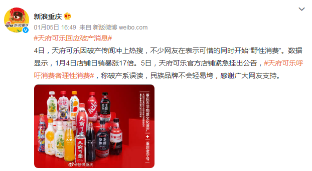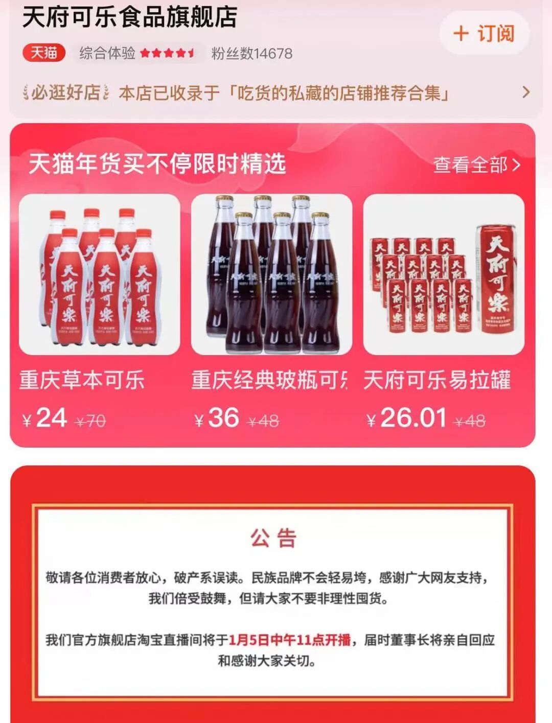 为此,天府可乐官方店铺紧急挂出公告,称破产系误读,民族品牌不会轻易垮,感谢广大网友支持。同时,还呼吁消费者理性消费。