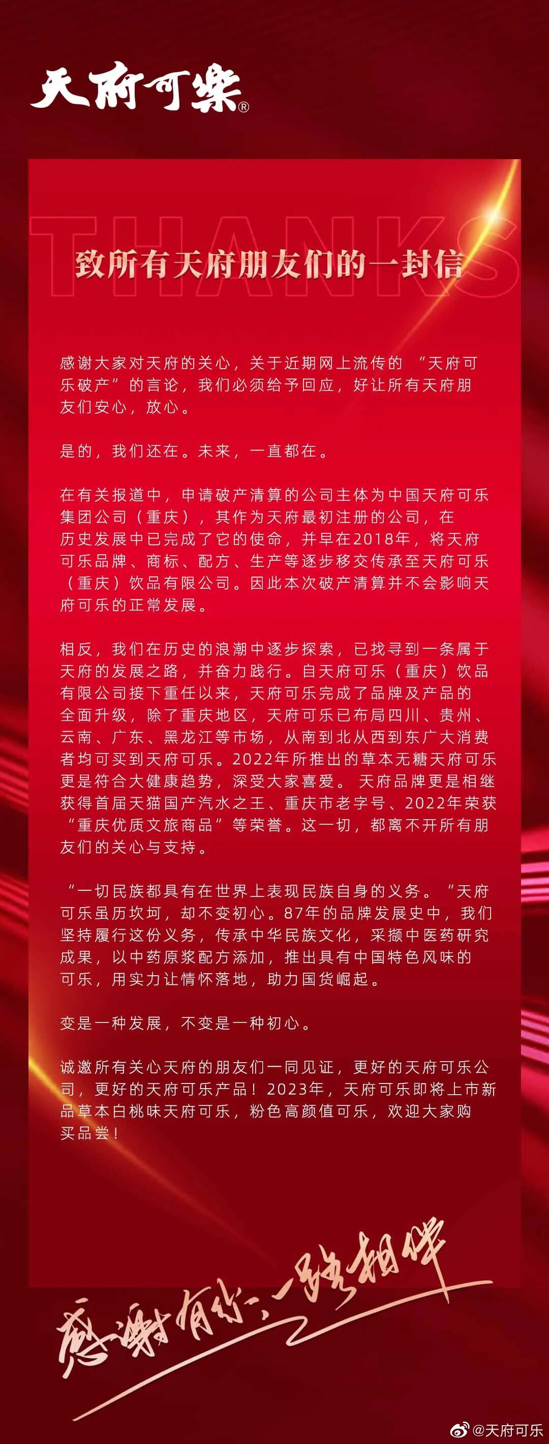 翻开天府可乐官博可以看到,在公司回应媒体破产传闻的同时,不仅买了#天府可乐回应破产消息#热搜,还在1月4日中午12点,官方发布了《致所有天府朋友的一封信》。