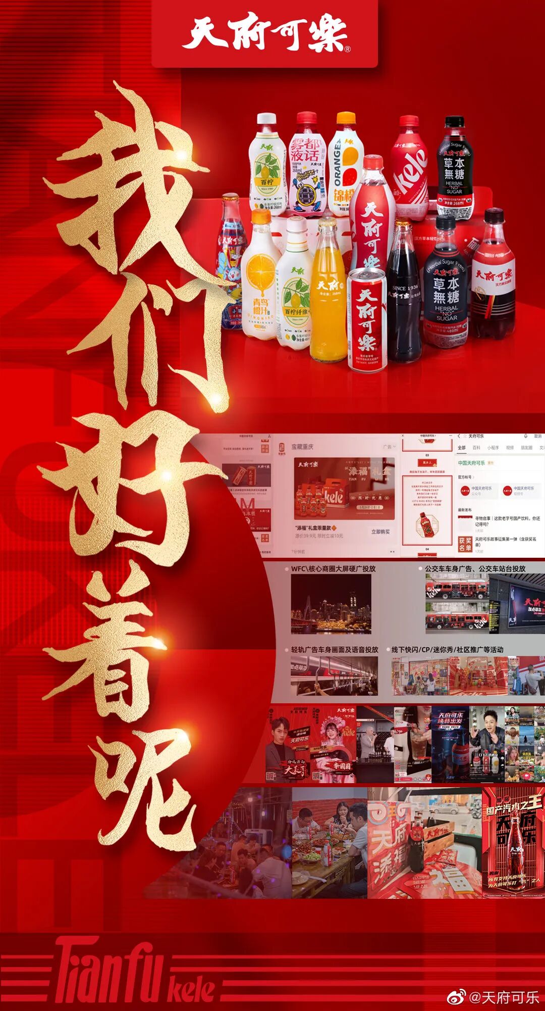 下午4点,官方还特意发布一张“我们好着呢”海报,海报中不仅展现了天府可乐过往的各种传播活动,而且天府可乐“产品家族”还集体亮相。