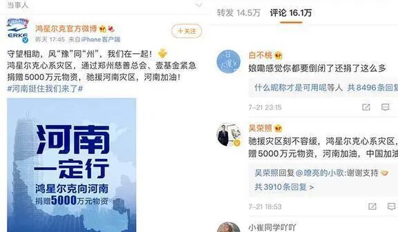 2021年7月河南暴雨引起全社会广泛关注,企业和明星捐款的消息陆续登上微博热搜。鸿星尔克也在自己的官方微博发布了向河南灾区捐赠5000万元物资的消息。