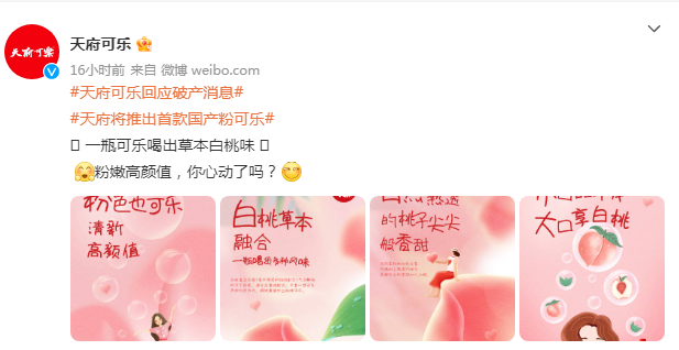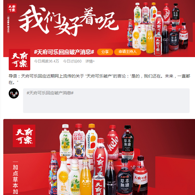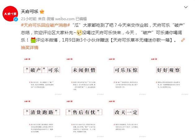 随后,天府可乐又以“破产”为话题玩了一把自我调侃的网络梗,可谓网感十足。