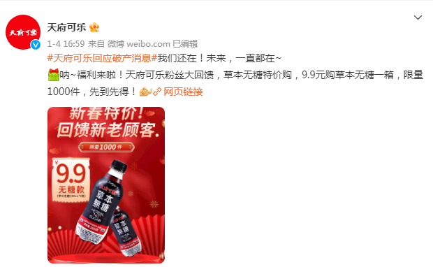 紧接着1月4日下午5点,天府可乐再次借助回应破产传闻的契机,发起了一波“新春特价,回馈新老顾客”的促销活动。