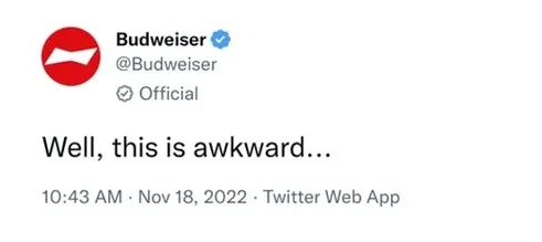 收到此消息后,百威还曾在社交媒体发文称,“Well, this is awkward…(嗯,这事儿太尴尬了……)”。不过随后,官方又删除了该推文。