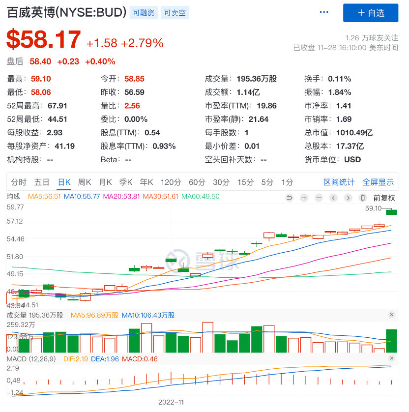 在国际足联发布世界杯禁酒令当日,百威英博以55.53美元/股收官,同比上涨0.95%。截至11月28日收盘,百威英博也涨至58.17美元/股,在一个月的时间里,百威股价上涨了20%左右。