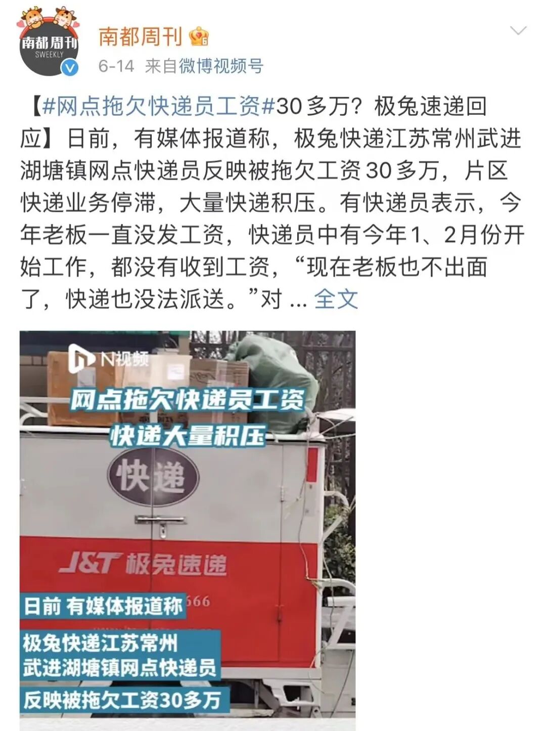 “极兔快递被爆拖欠快递员工资。”