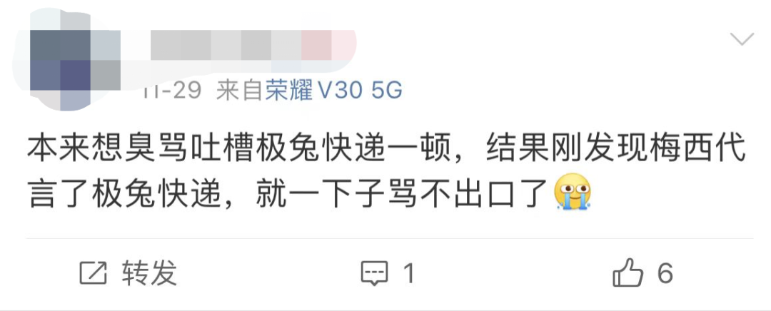 甚至还有网友直言:“同城快递都要4天,快递送的太慢。本来想臭骂吐槽极兔快递一顿,结果刚发现梅西代言了,就一下子骂不出口了。”