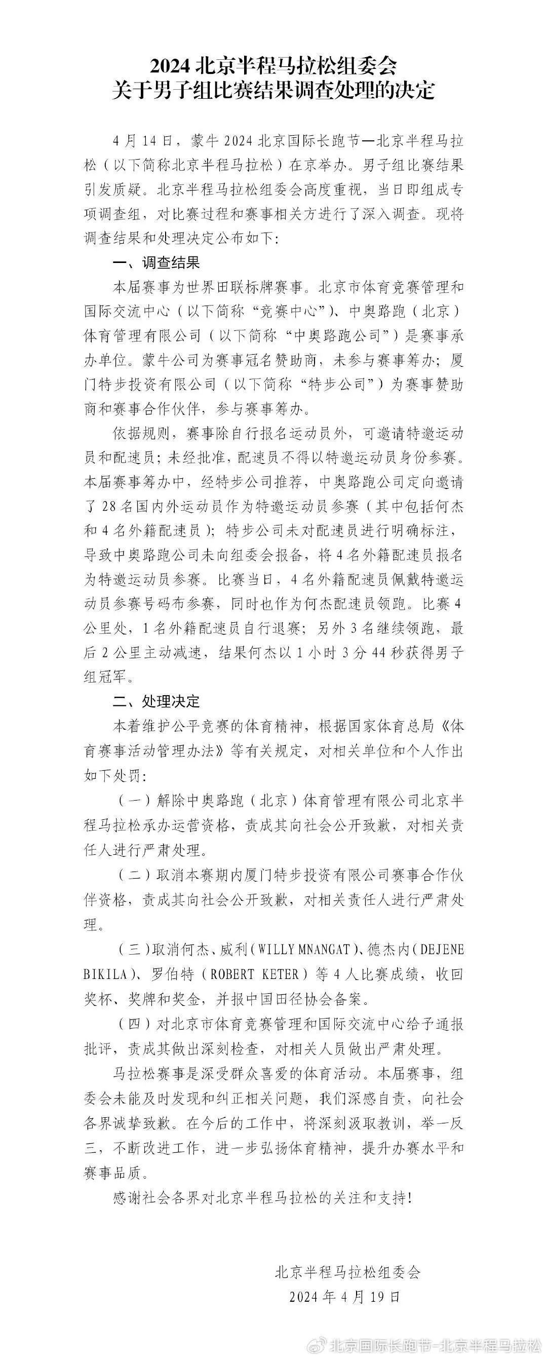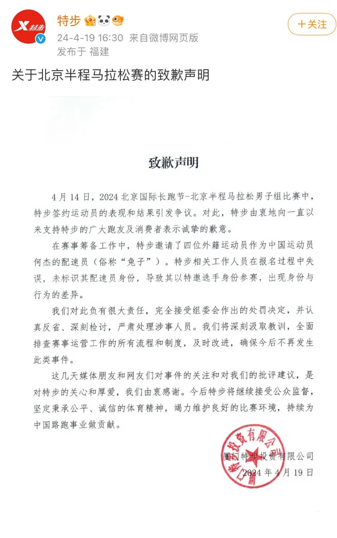 北京国际长跑节-北京半程马拉松组委会发布通报,声明中指出三位外籍运动员为配速员(俗称“兔子”,作用是帮助参赛选手保持节奏,以提高比赛成绩),但特步公司未对配速员进行明确标注,导致组委会误将四名外籍配速员报名为特邀运动员参赛。