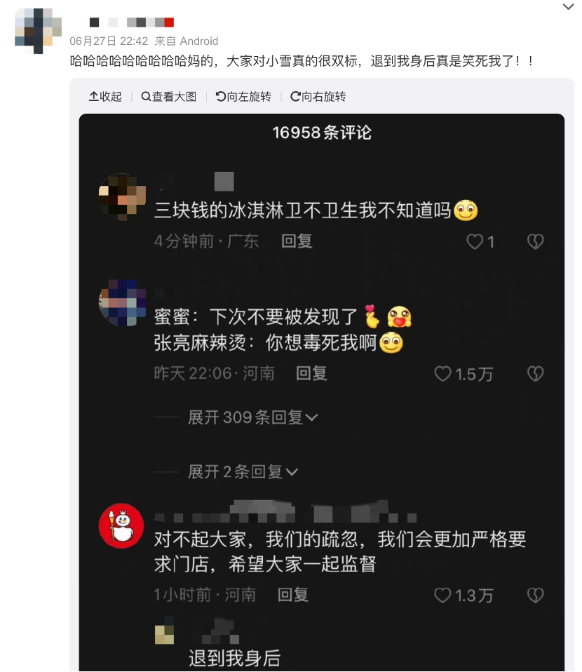 作为对比的是瑞幸因为冰块太多反倒遭全网热嘲,网友们顶着蜜雪冰城的头像在评论区各种“冷嘲热讽”,究极阴阳。