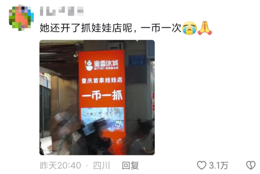 就比如前两个月,蜜雪冰城还在重庆观音桥开了首家“抓娃娃店”,一个币一抓,对比下目前市面上2个币或者3个币一抓的娃娃店,简直不要太良心。