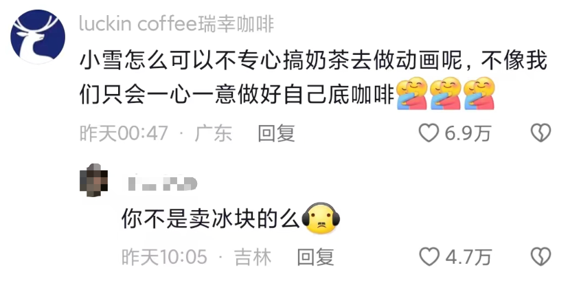 就像在评论区里,这段时间始终被雪王压着一头的瑞幸终于找到了反击的机会,赶紧对蜜雪冰城阴阳怪气了两句:“小雪怎么可以不专心搞奶茶去做动画呢,不像我们只会一心一意做好自己的咖啡”。
