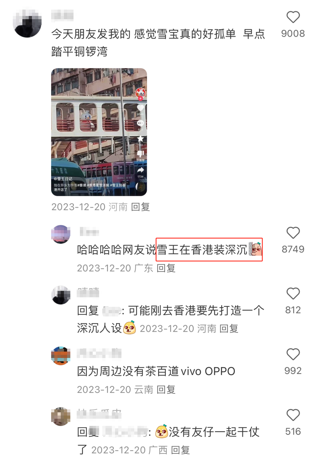 一条“雪王在香港装深沉”的评论打破了这种“独在异乡为异客”的孤寂感。