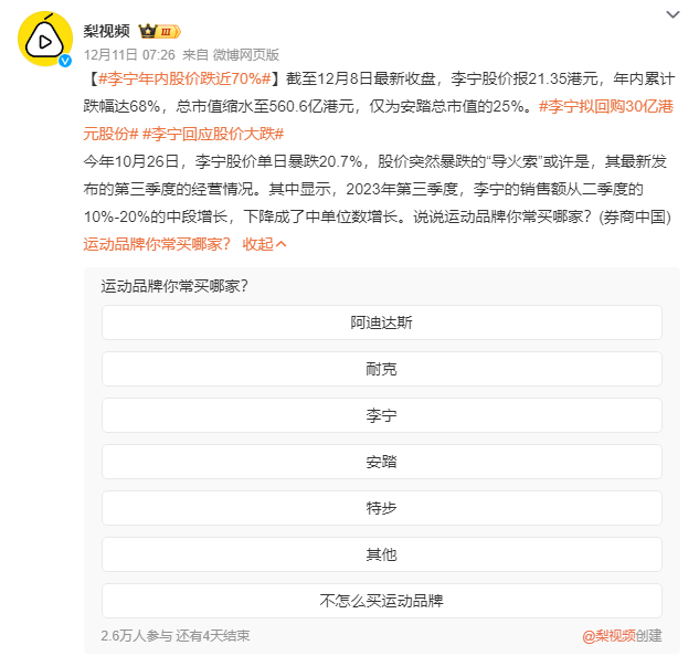 从最初的国潮一哥,到后来的“我拿李宁当国货,李宁拿我当大佐”,李宁的市值、业绩崩塌之路,也是其口碑的崩塌之路。