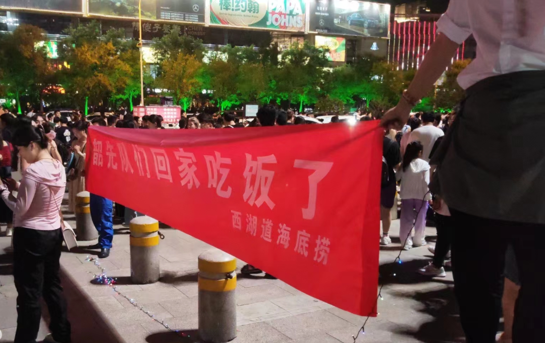 西湖道海底捞为张韶涵粉丝拉横幅:韶先队们回家吃饭了。
