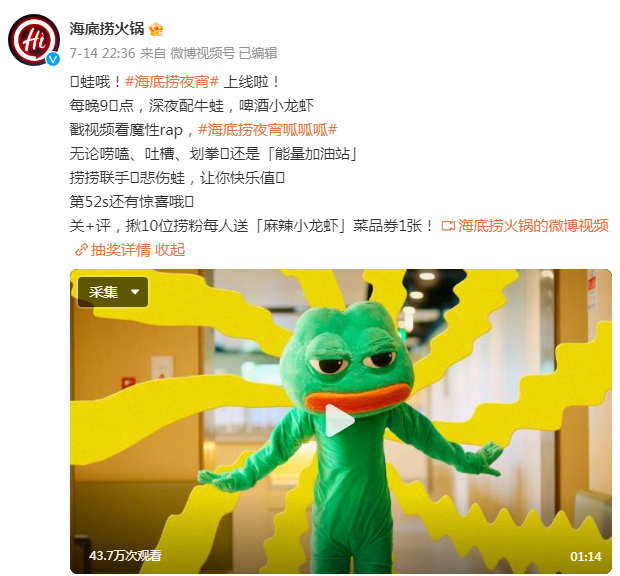 晚上九点后,在产品上增加卤味、蛙锅、小龙虾和啤酒,还通过热门IP悲伤蛙的梦幻联动,打造夜宵仪式感。