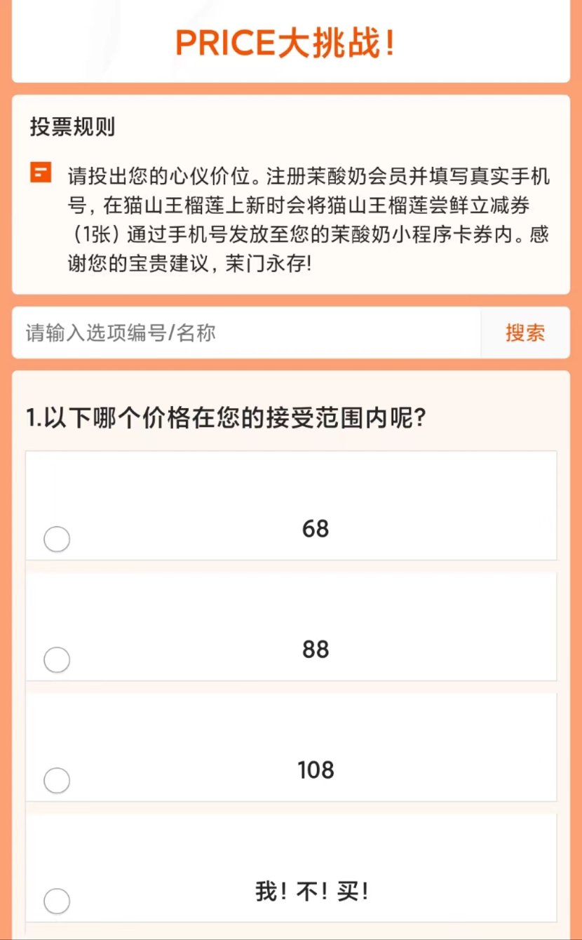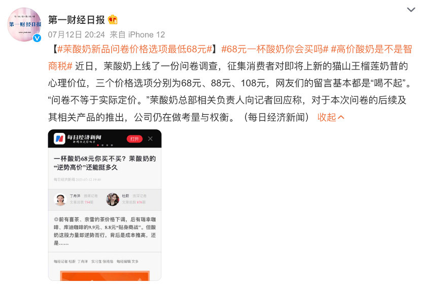 不信你看啊,上边提到那个新品调研最低价格68一杯惹众怒了么,然后茉酸奶这次给了个贼高级的回应:
