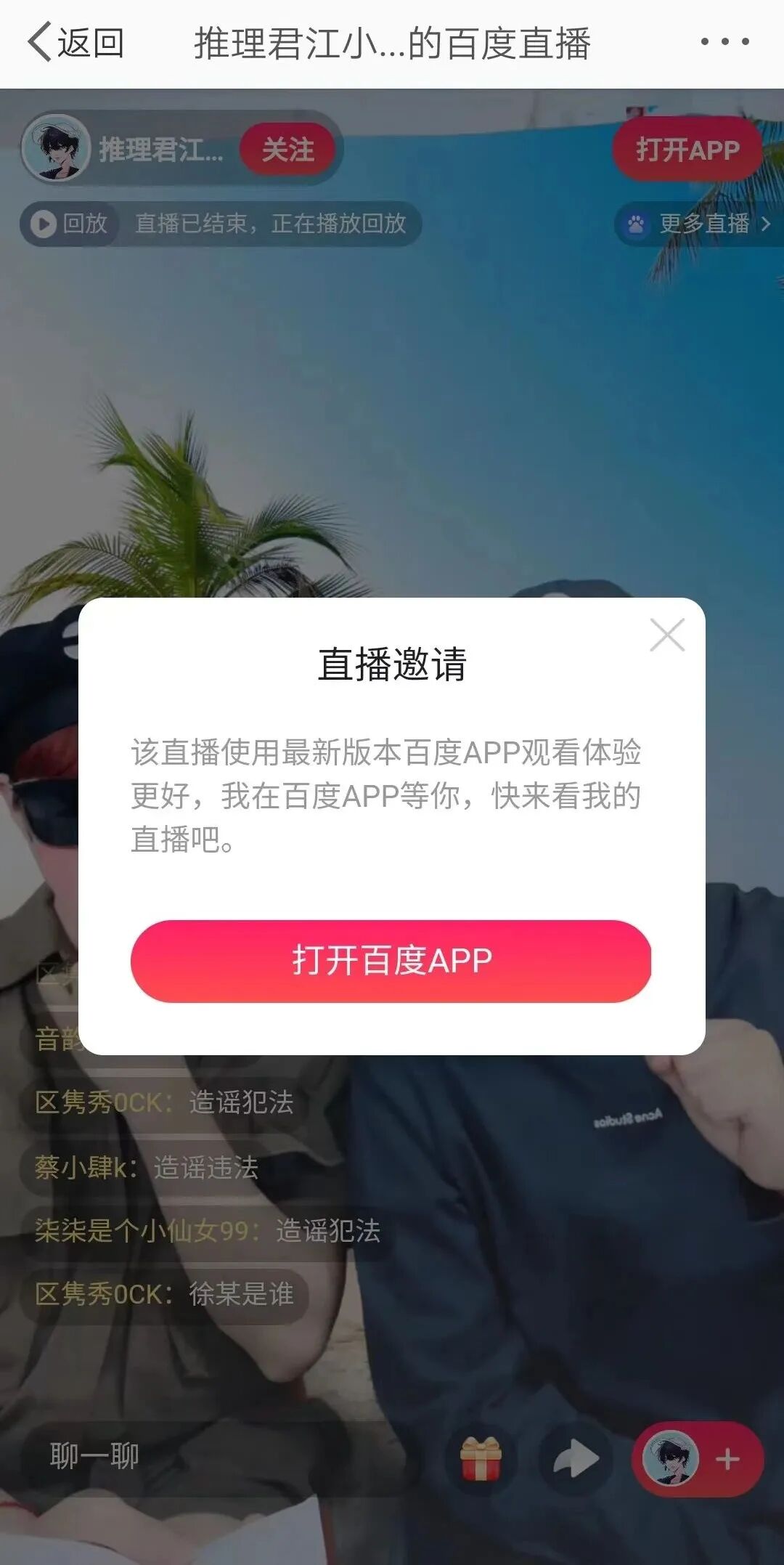 网友如果想在直播间发弹幕互动,就需要下载或者跳转到百度APP。这波大瓜引爆的大流量,对百度的加持可想而知。