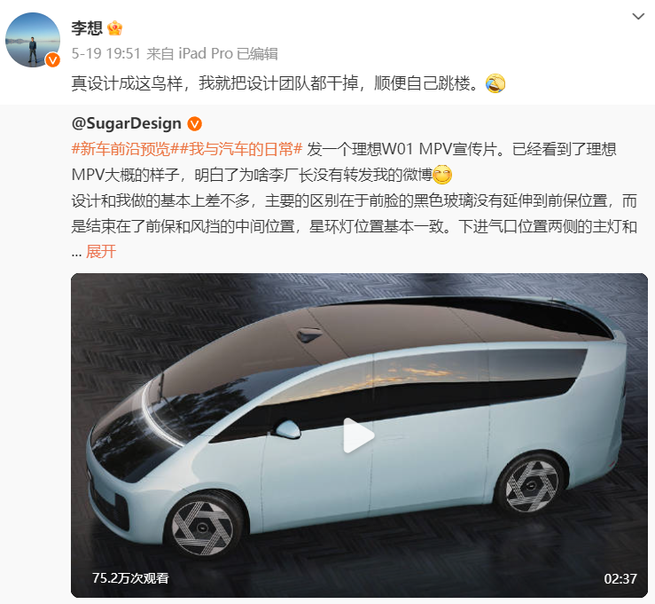 有意思的是在今年5月份,李想转发了某博主制作的理想MEGA渲染图,并撂下一句:“真设计成这鸟样,我就把设计团队都干掉,顺便自己跳楼。”