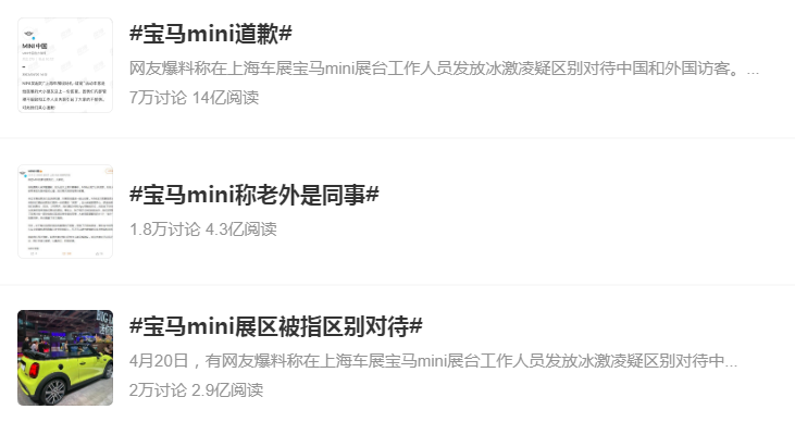 先是宝马MINI展台工作人员拒绝给中国访客发放冰淇淋,但外国访客却可以轻松拿到;之后在当天下午又有主播和宝马MINI展台方发生冲突,很快被强行带离现场。