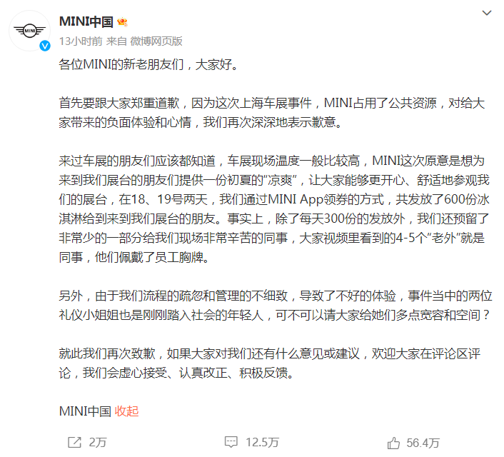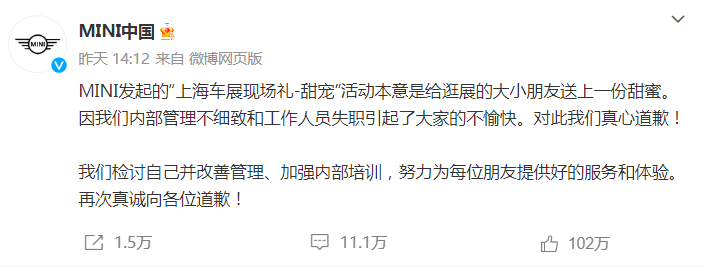 截止到目前,宝马MINI此前所发布的车展现场冰淇淋宣传相关微博已经被删除,不过最新的道歉微博下面仍然有不少网友吐槽。“实在不行,还是花点钱换个公关团队吧”、“这道歉声明写的比人工智能差了十万八千里”等等。