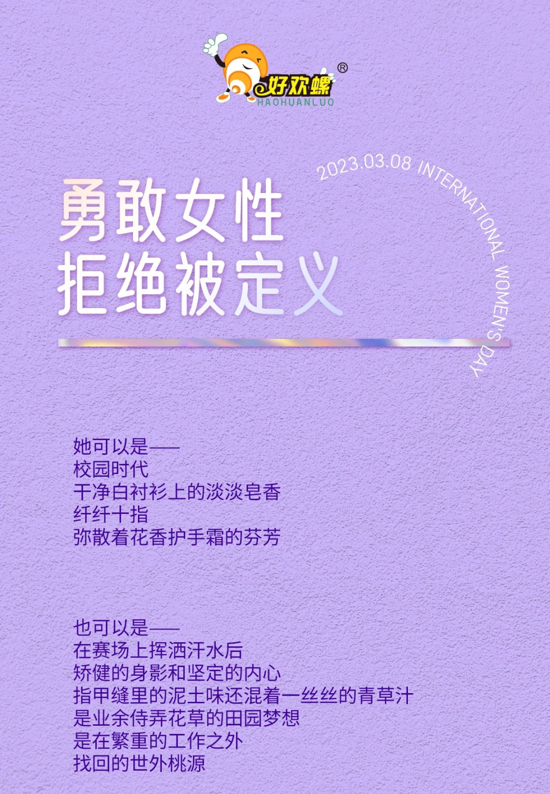 《女性,是什么味道?》,是三八妇女节当天好欢螺发布的文案。文章内容大意是指女性是不被定义的,每个女生都自带光芒。