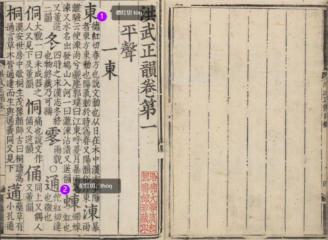 比如,韵尾的平声,一東,发音为 ōŋ, ūŋ,最后一组是喉音,为 iōŋ, iūŋ