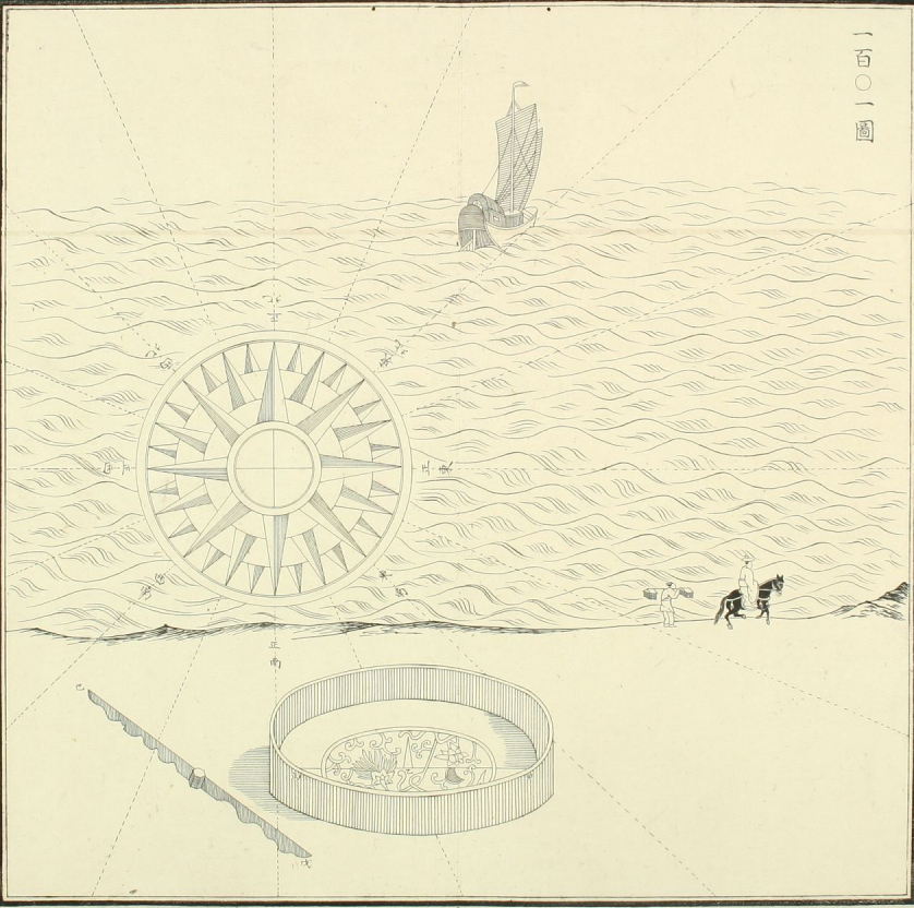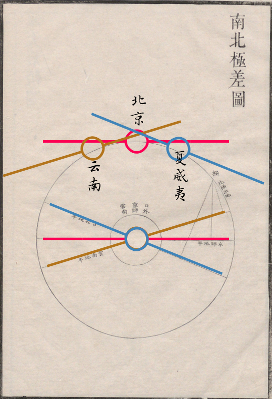 然后,连接秦岭山脉,北极,南海,做垂直线,在此位置建子位