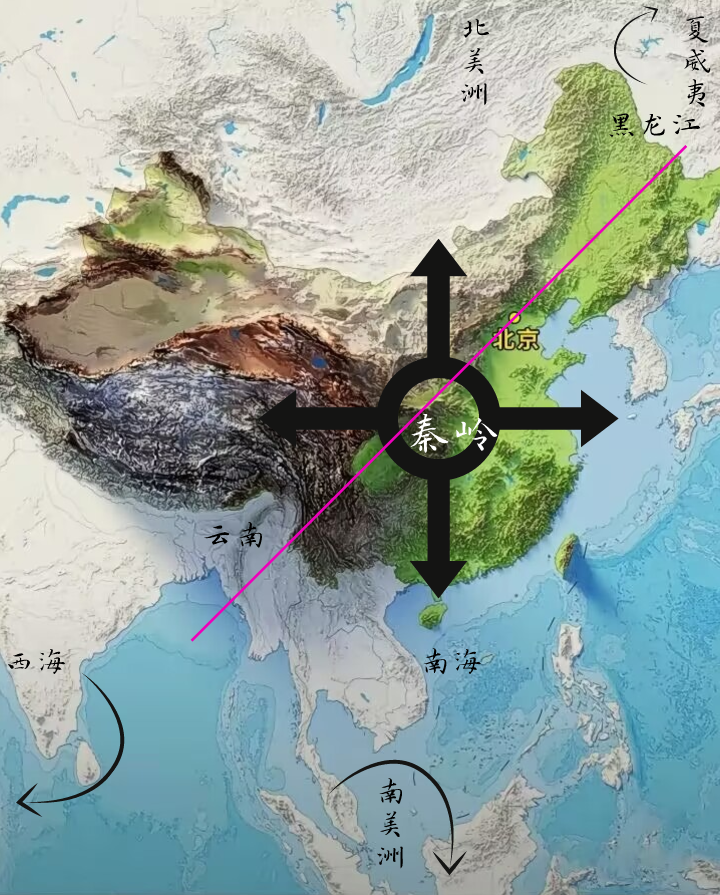 如图所示,我们将秦岭设置为地球正中央,也叫地心