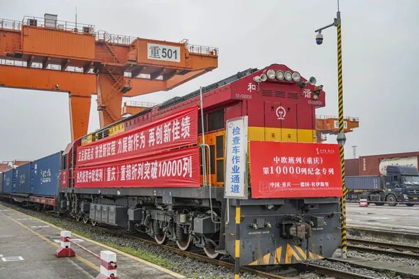 2022年6月23日,中欧班列(重庆)第10000列列车在重庆团结村中心站等待发车/图源:新华社