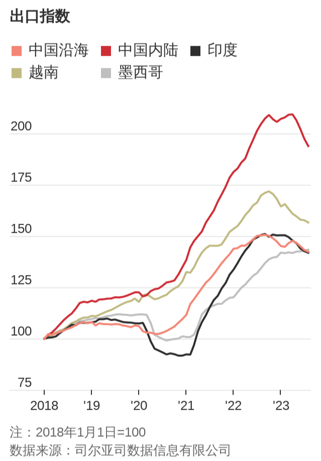 CEIC数据显示,2018年到2022年的五年间,中国中西部15个省份的出口额猛增了94%。截至2023年8月份的前12个月里,中西部15省的出口总额为6300亿美元。与之对比,同期印度出口总额为4250亿美元,墨西哥为5900亿美元,越南为3460亿美元。