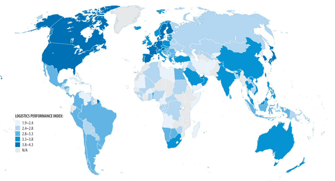 全球贸易物流绩效表现(区域颜色越深,LPI评分越高)/图源:2023年贸易物流绩效指数(Logistics Performance Index,LPI)报告