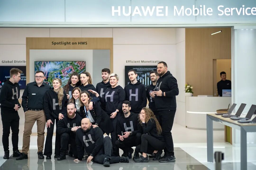 西班牙巴塞罗那,华为员工在2023年世界移动通信大会上合影留念/图源:视觉中国