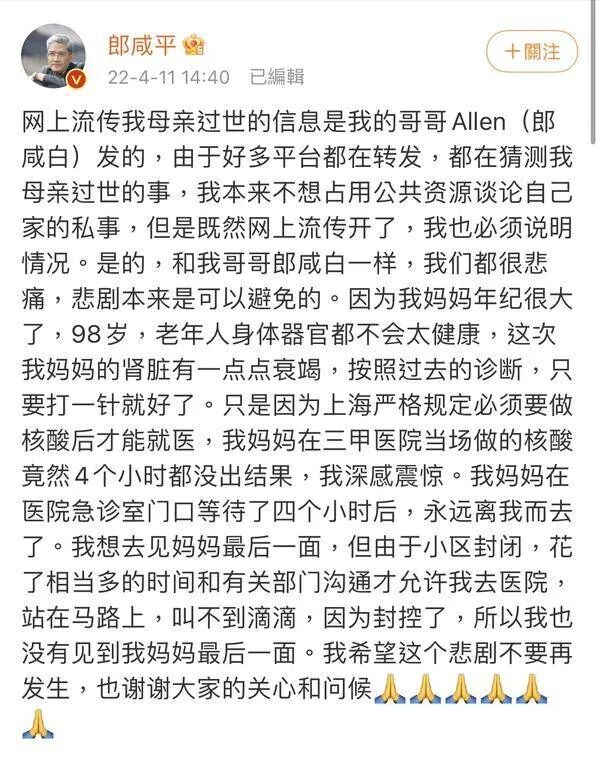 在上海“封城”期间,郎咸平98岁的母亲因为核酸结果迟迟没有出来,耽误就医时间导致不幸去世。