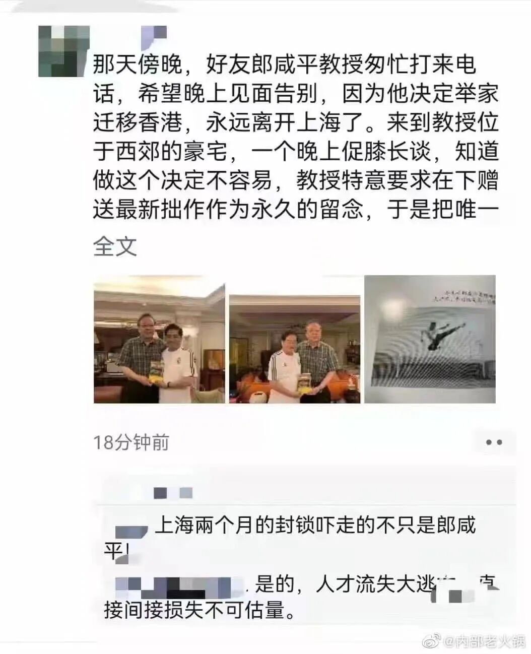 18号晚上,一条朋友圈截图在网上流传,内容是一位自称郎教授朋友的人,透露了郎教授要离开上海,举家迁移到香港,并来与他促膝长谈道别。