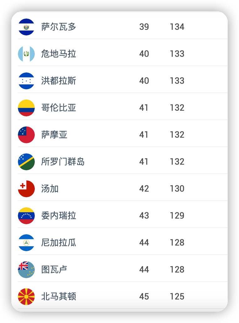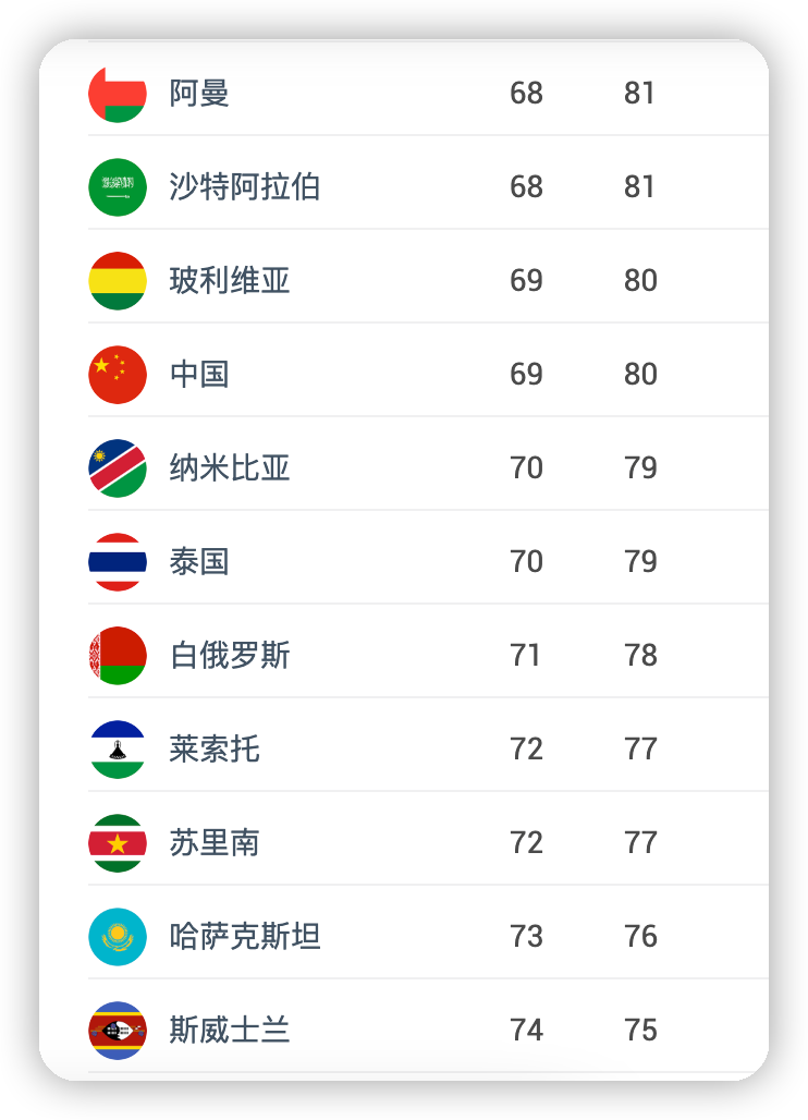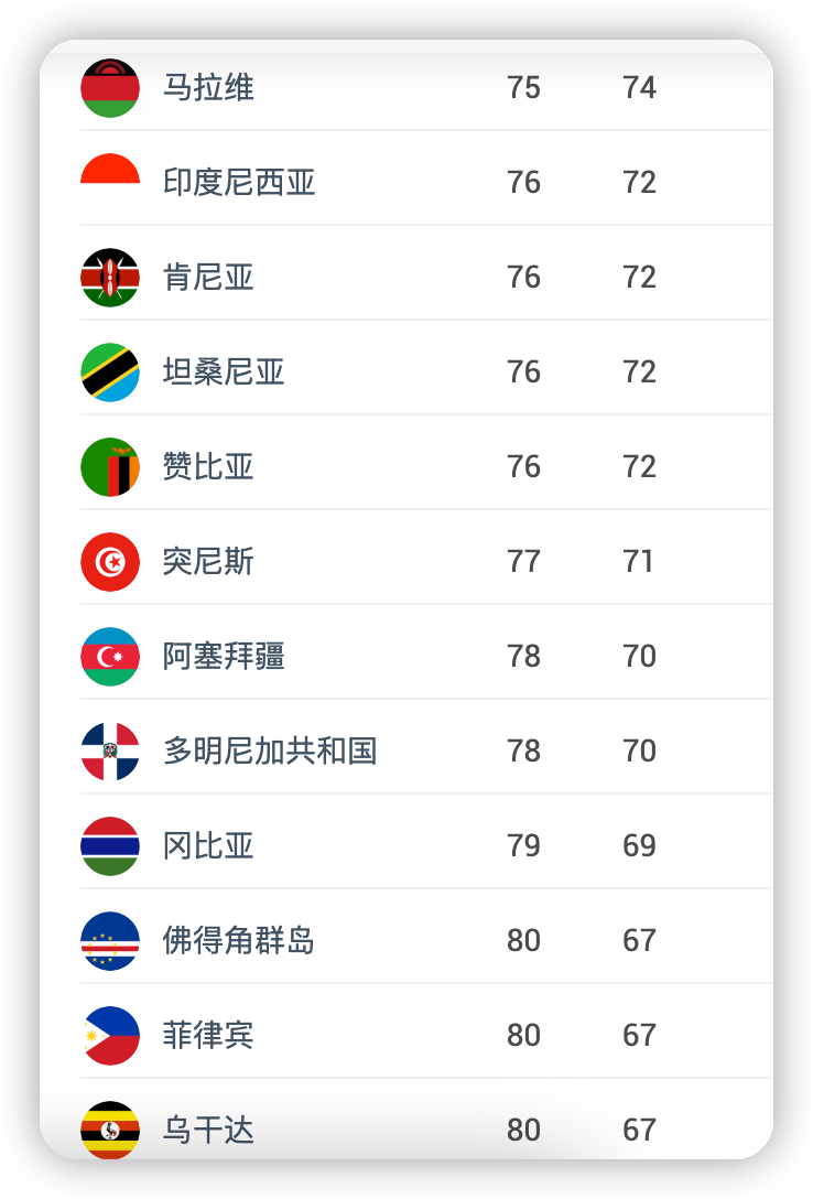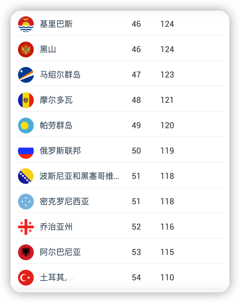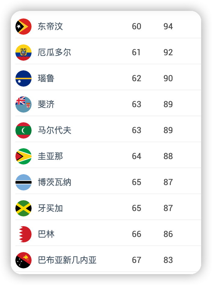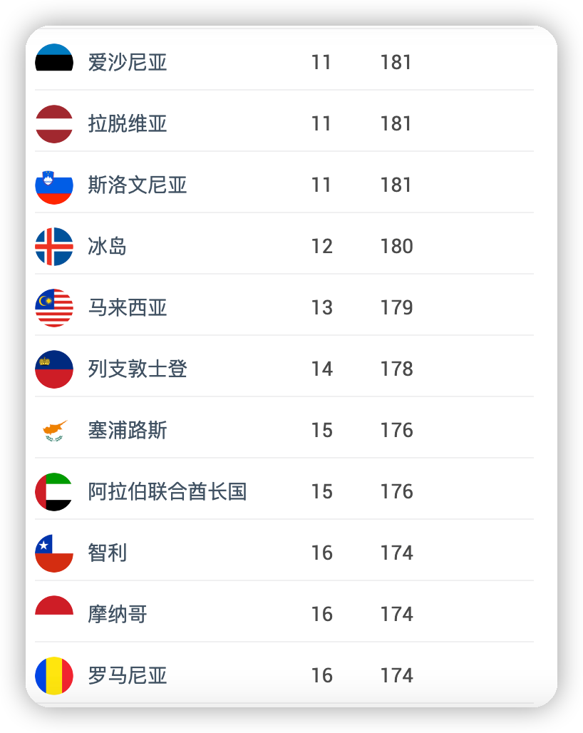 第11名到16名的国家里,除了欧洲国家,开始出现了亚洲的马来西亚、阿联酋,还有南美唯一一个“发达国家”智利。