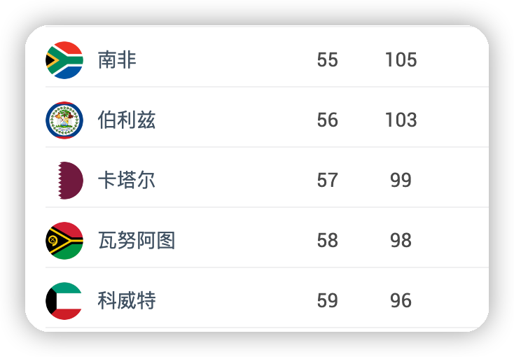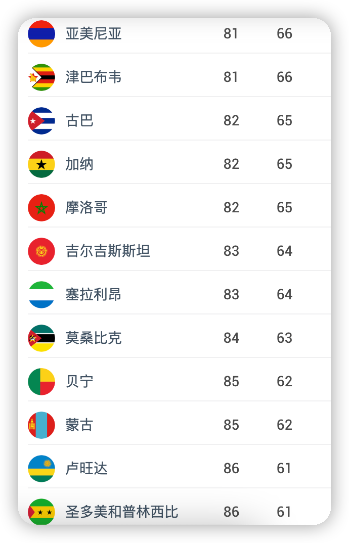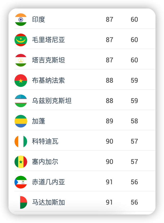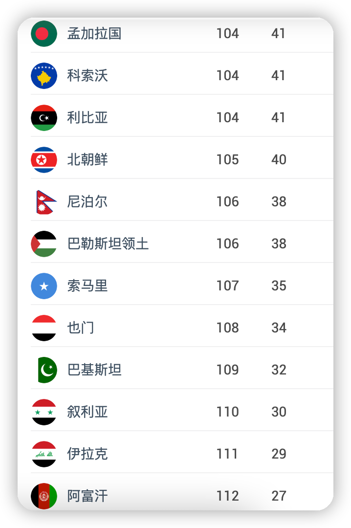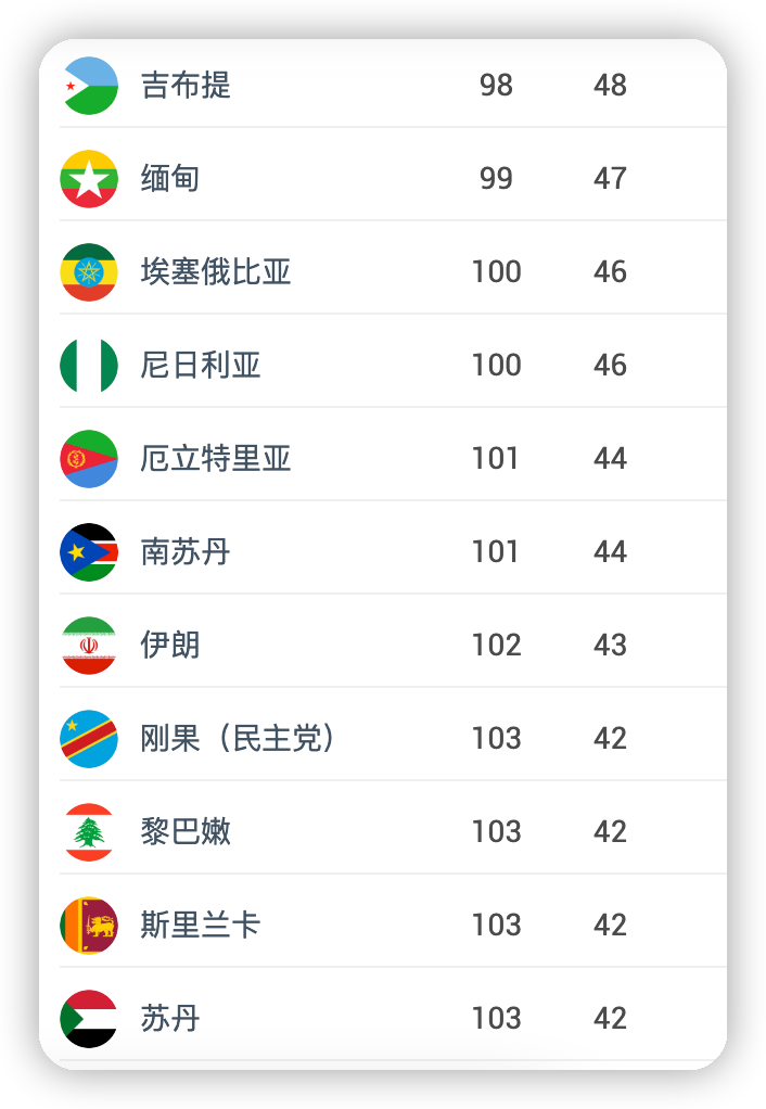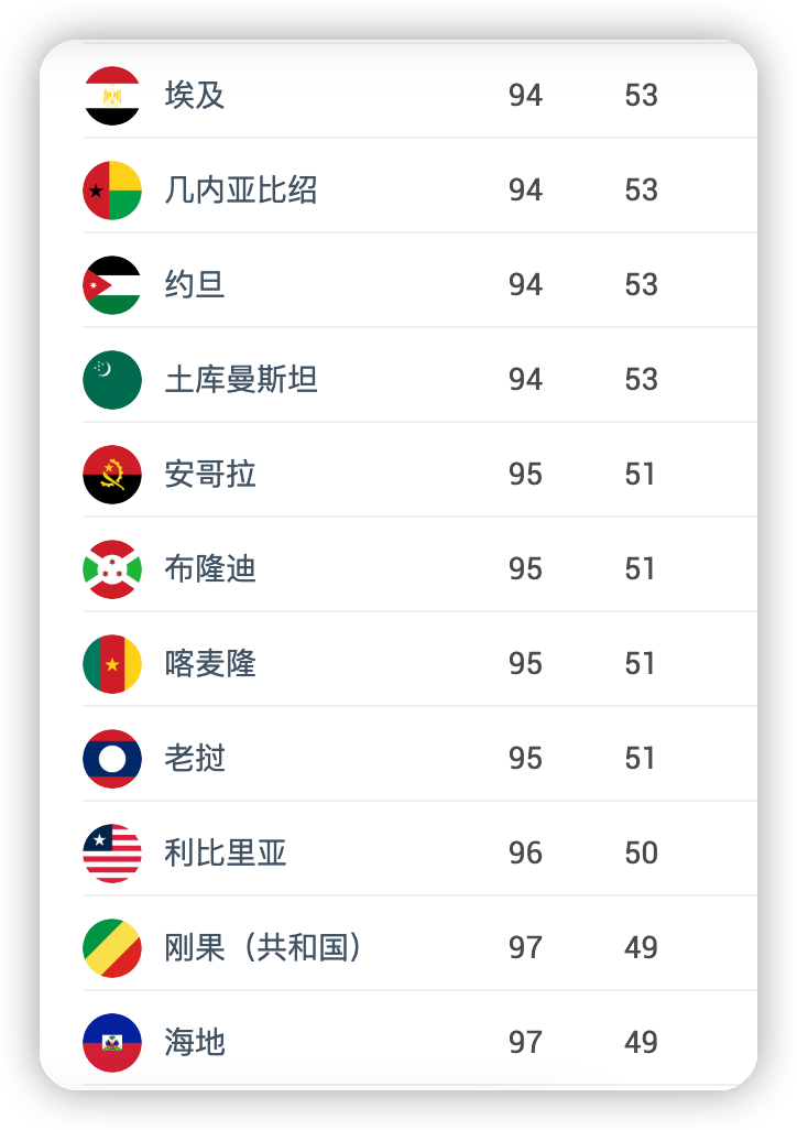 第11名到16名的国家里,除了欧洲国家,开始出现了亚洲的马来西亚、阿联酋,还有南美唯一一个“发达国家”智利。