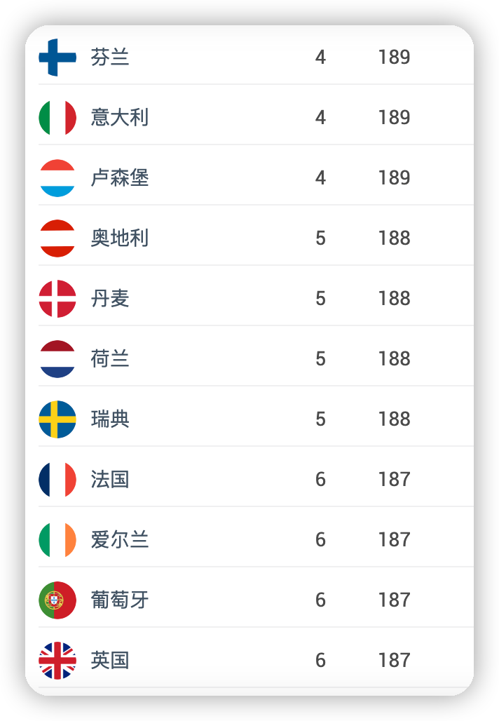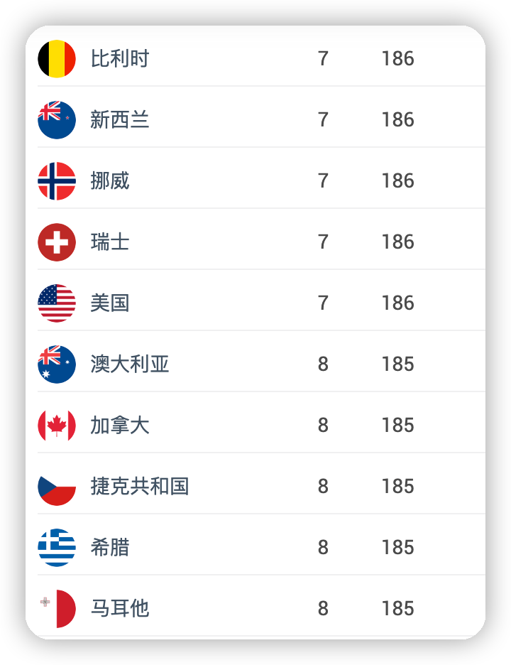 第4-10名中的25个国家里,除了澳大利亚、新西兰、美国、加拿大,其余全部都是欧洲国家。