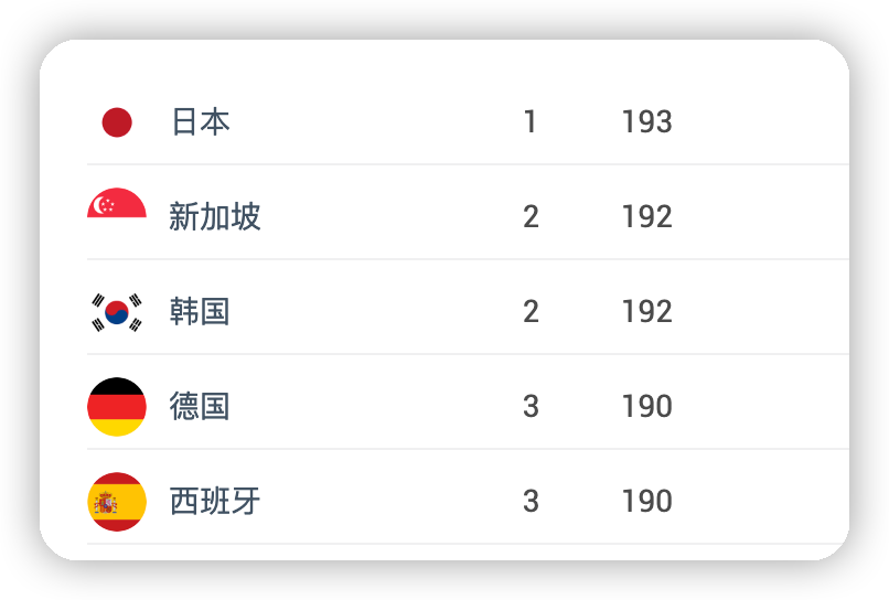 排名第一位的是日本护照,以免签数193个刷新了历史纪录,这可能是现代护照诞生以来,含金量最高的,用奥特曼的话说:“几乎能带你去任何地方”。