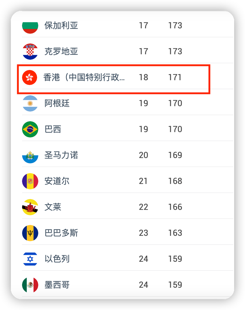 接下来的17名到24名里面,开始出现了中国香港护照,以免签数171排名全球第18位,这个成绩与上一季度持平。