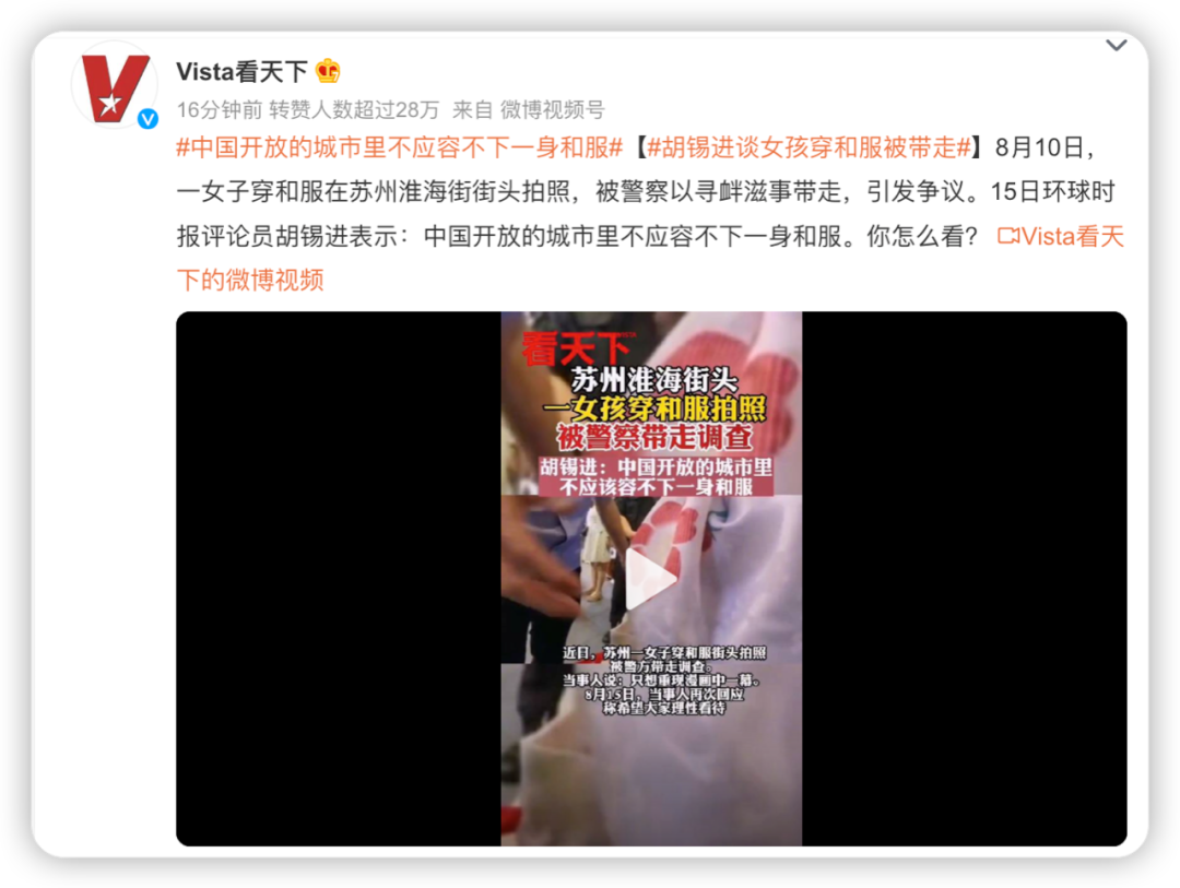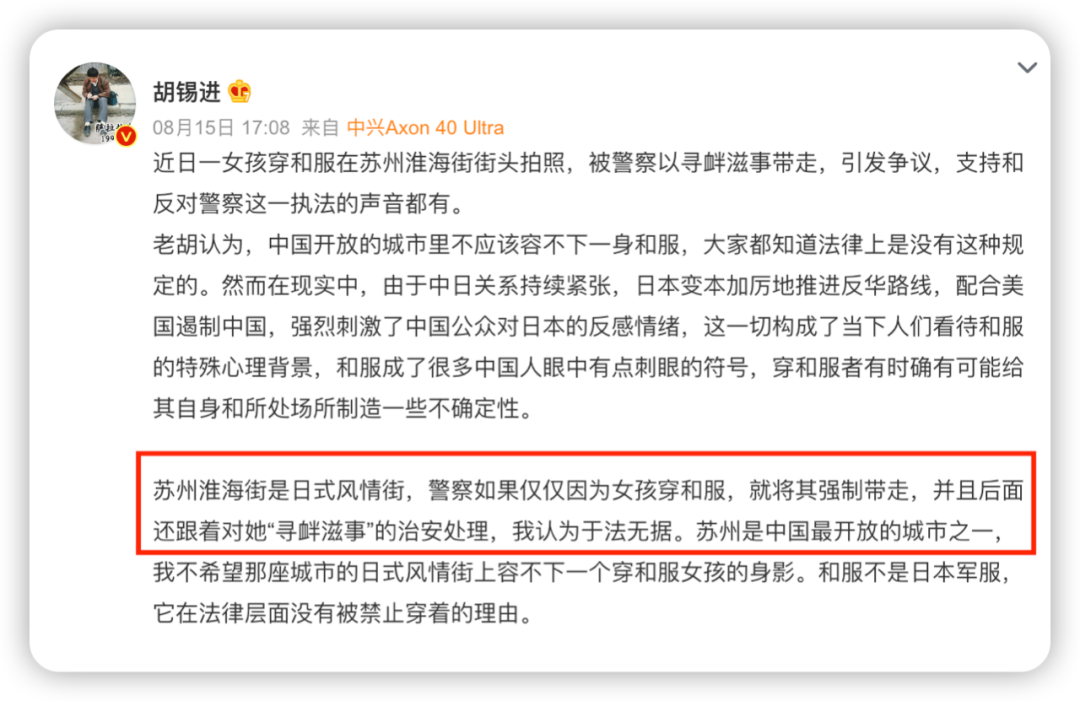 这种事连胡锡进这样的人都看不下去,他都评论说:“苏州淮海街是日式风情街,警察如果仅仅因为女孩穿和服,就将其强制带走,并且后面还跟着对她“寻衅滋事”的治安处理,我认为于法无据。”