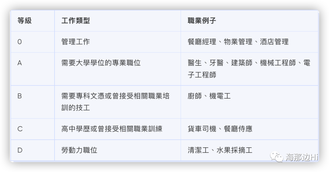 A. 加拿大国家职业分类系统 :将不同职业种类、技能水平、工作职责划分成 5 个等级,只有 0、A 或 B 级职业才可透过快速通道移民到加拿大。