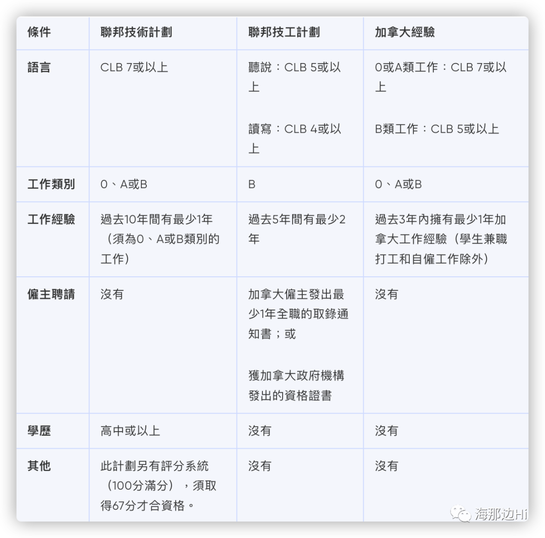 各个计划对申请人的工作经验、学历等条件要求都不同,以加拿大技术移民的三个计分系统,按照申请人的职业及语言水平分别作出评级: