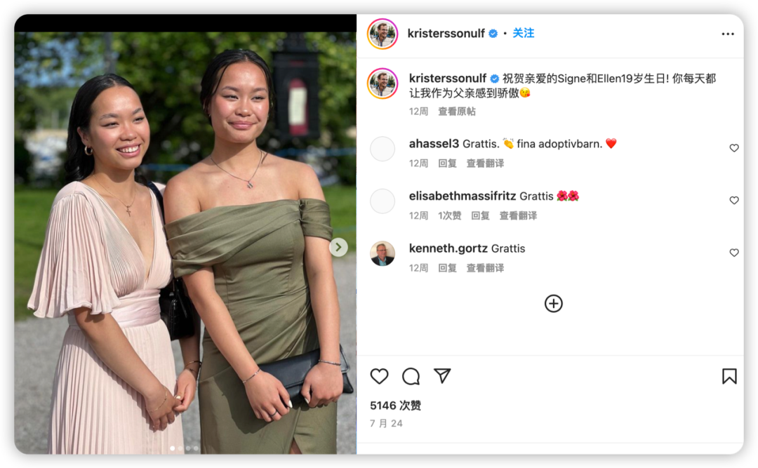 不过在查看这位新首相资料的时候,一些生活照片还是引起了我的注意。在这些照片里,克里斯特松和三个东方面孔的女性非常亲密的合影。翻译过这些照片的推文后才知道,原来这三个姑娘,都是他和妻子从中国领养的养女。