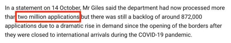 看来移民局这个工作也不好干,这工作量确实有点大,尤其是在澳洲重新开放国境以来,也就是今年夏天以来,移民局已收到近 222 万份新申请,同比一下子翻了4倍!